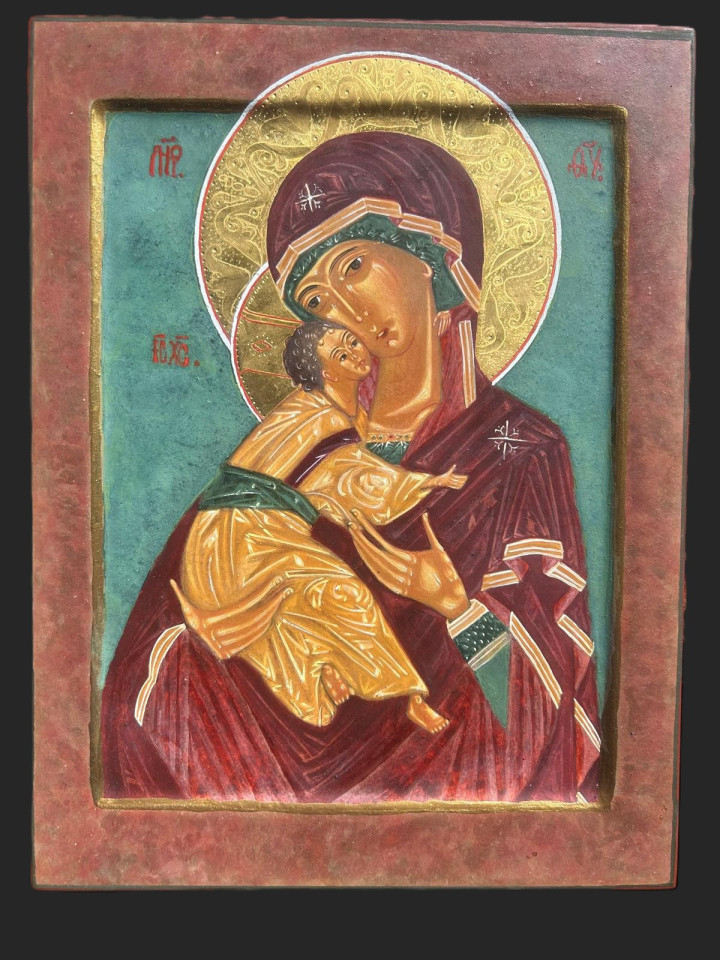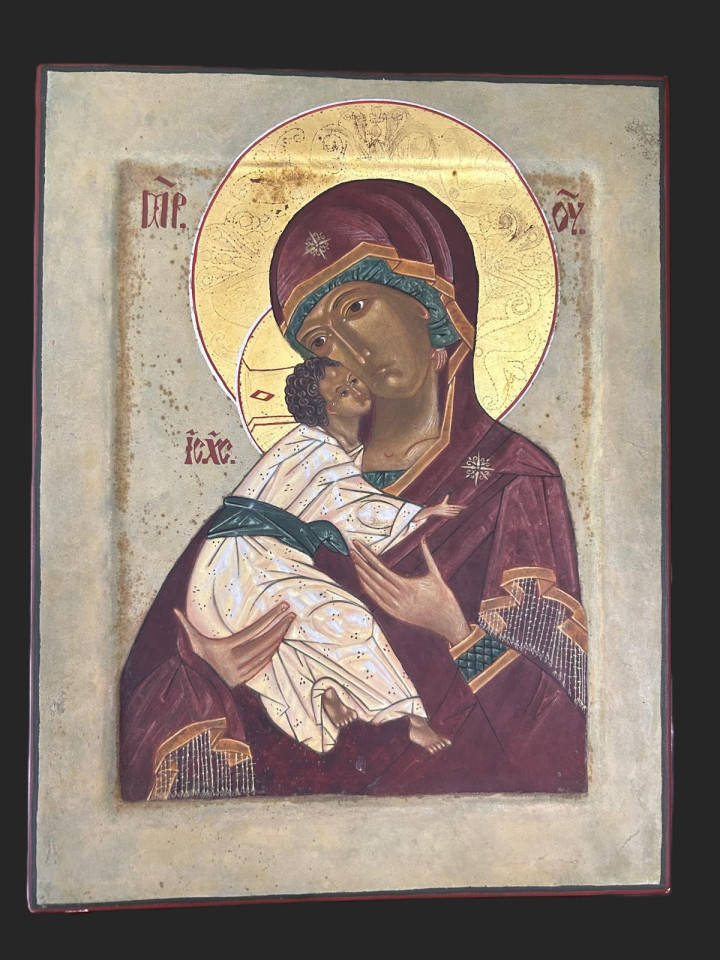 The Eleousa is a representation of the Virgin Mary in icons in which the Christ Child is nestled against her cheek.